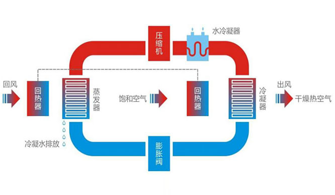 3)與污泥換熱蒸發出來的濕熱空氣從頂部回到熱泵主機,通過蒸發器冷卻除濕析出冷凝水排出變成冷干空氣經冷凝器加熱成熱干空氣送回到網帶底部不斷循環,從而達到污泥干化目的。